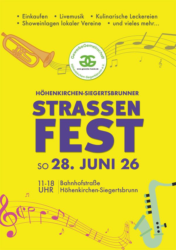 Die Gewerbegemeinschaft Höhenkirchen-Siegertsbrunn veranstaltet wieder ein Straßenfest für Jung und Alt, mit einem abwechslungsreichen Programm, gastronomischen Schmanckerln und vielfältigen Ausstellern.